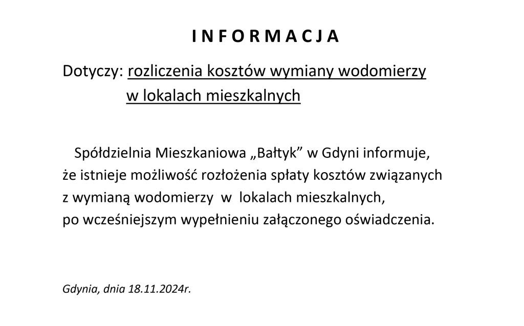 Informacja i oświadczenie w sprawie rozliczenia wymiany wodomierzy radiowych utworzone przez administrator | gru 16, 2024 | Bez kategorii | 0 komentarzy Oświadczenie w sprawie rozliczenia wymiany wodomierzy Oświadczenie w sprawie rozliczenia wymiany wodomierzyPobierz